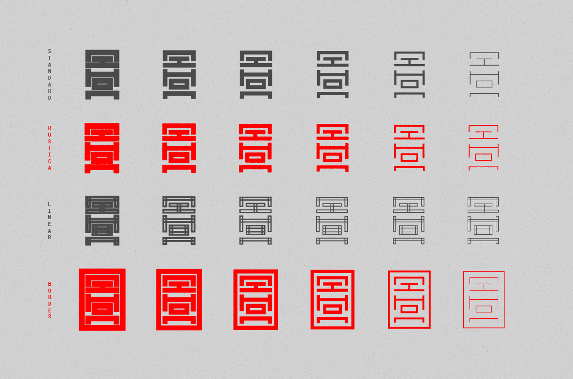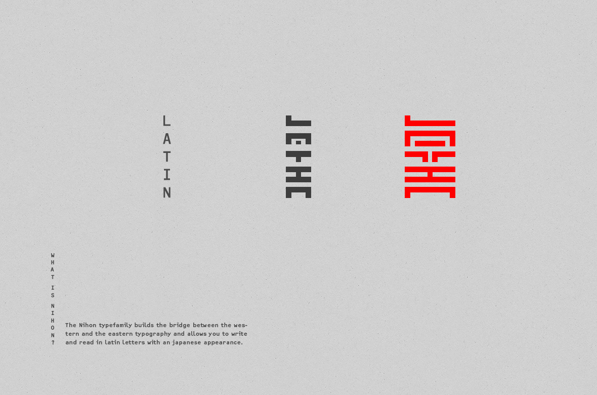 Nihon字體作為一個在德國奧芬巴赫HfG的Sascha Lobe字體類別中自行發(fā)起的項目。由于我對日本平面設計和哮喘有著濃厚的興趣,我的研究將我引向了傳統(tǒng)的Ukio es。17世紀早期的木刻版畫。一般來說,這些版畫是由藝術家們用他們的個人印章簽名的。印加海豹。漂亮的裝飾性印刷杰作,但可悲的是,如果你不會說日語,就無法閱讀。我的想法是,將所有拉丁字母按照傳統(tǒng)印加印章的視覺語言進行抽象和全新的設計。目標是,用你的語言書寫,卻有著美麗的日文印加印章的外觀。經(jīng)過幾個月的構思、設計和幾個晚上的睡眠,第一個Nihon字體完成了。