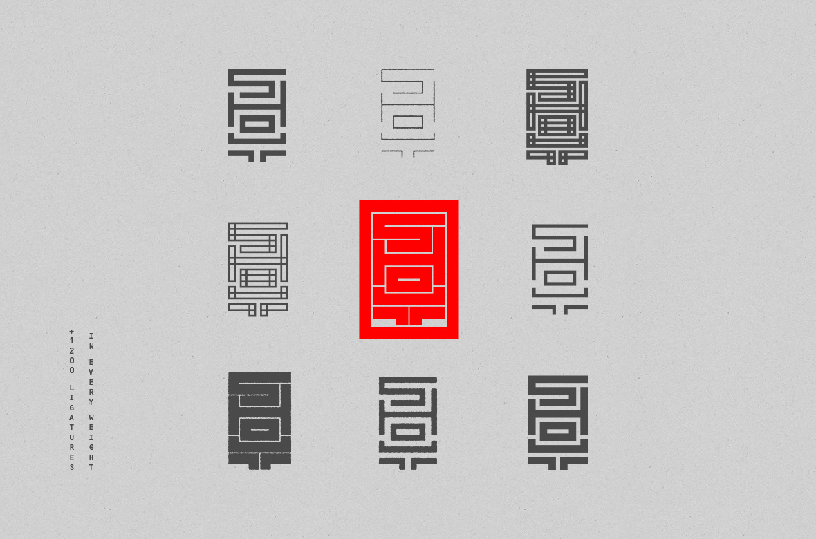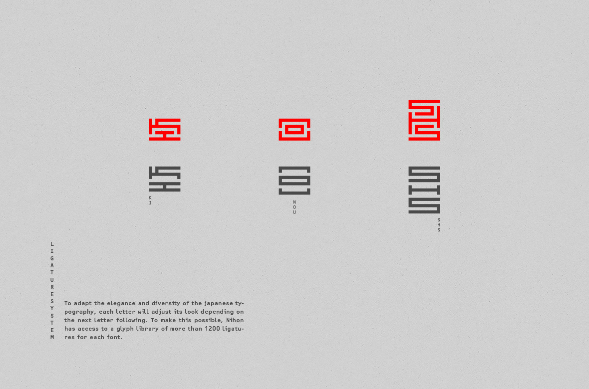 Nihon首次出現(xiàn)在HfG Rundgang 2014展會上,反響非常熱烈。我的目標是將Nihon字體擴展到一個有更多字形和連字的家族。到目前為止,Nihon提供了4種字體設計,每種字體有6個權重,所有字體的連字和字形總數(shù)超過30000個。