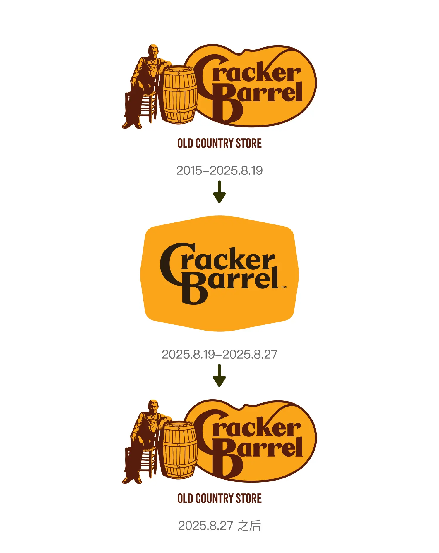 8月19日,Cracker Barrel啟動了一項規(guī)模達(dá)7億美元的品牌升級計劃,內(nèi)容涵蓋更換標(biāo)志、更新菜單與調(diào)整門店裝修風(fēng)格。其中,新標(biāo)志的設(shè)計引發(fā)了廣泛爭議——它舍棄了餐廳沿用多年的經(jīng)典人物形象,轉(zhuǎn)而采用更為簡潔的純文字樣式。這一改動讓眾多老顧客難以接受,直接導(dǎo)致餐廳股價應(yīng)聲暴跌12%,詳細(xì)閱上一篇文章:知名連鎖店餐廳Cracker Barrel更新了品牌設(shè)計