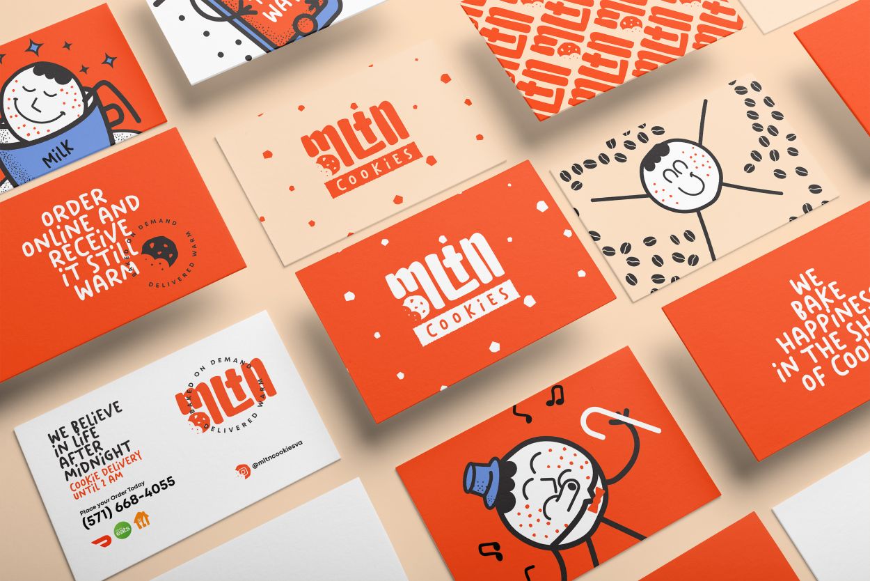 品牌形象設(shè)計(jì)中對(duì)于顏色,我們使用了充滿活力和冷色的組合。調(diào)色板保持復(fù)古,并且還與品牌的差異之一有關(guān),即直到凌晨 2 點(diǎn)才交付產(chǎn)品。我們使用了代表夜晚和夜空的藍(lán)色陰影。盡管有顏色,但它只是次要的,如果將來(lái)商業(yè)物流必須改變,你不會(huì)被它所束縛。