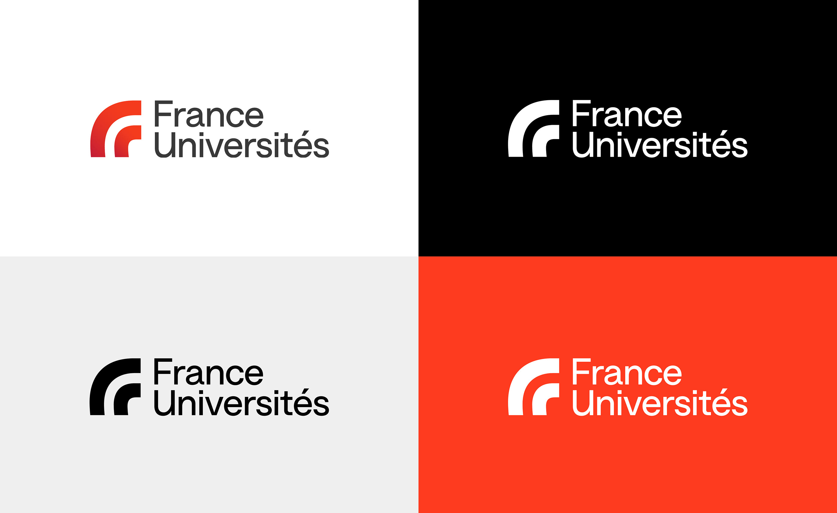 為了實(shí)現(xiàn)這一目標(biāo),Graphéine設(shè)計(jì)了一個(gè)標(biāo)志性的monogram。這個(gè)字母組合體現(xiàn)了法國(guó)大學(xué),它將代表法國(guó)領(lǐng)土的字母“F”的形狀與一所大學(xué)圓形劇場(chǎng)長(zhǎng)椅的抽象相結(jié)合。因此,這個(gè)標(biāo)志使1995年創(chuàng)立的第一個(gè)標(biāo)志的象征意義現(xiàn)代化并重新煥發(fā)活力。