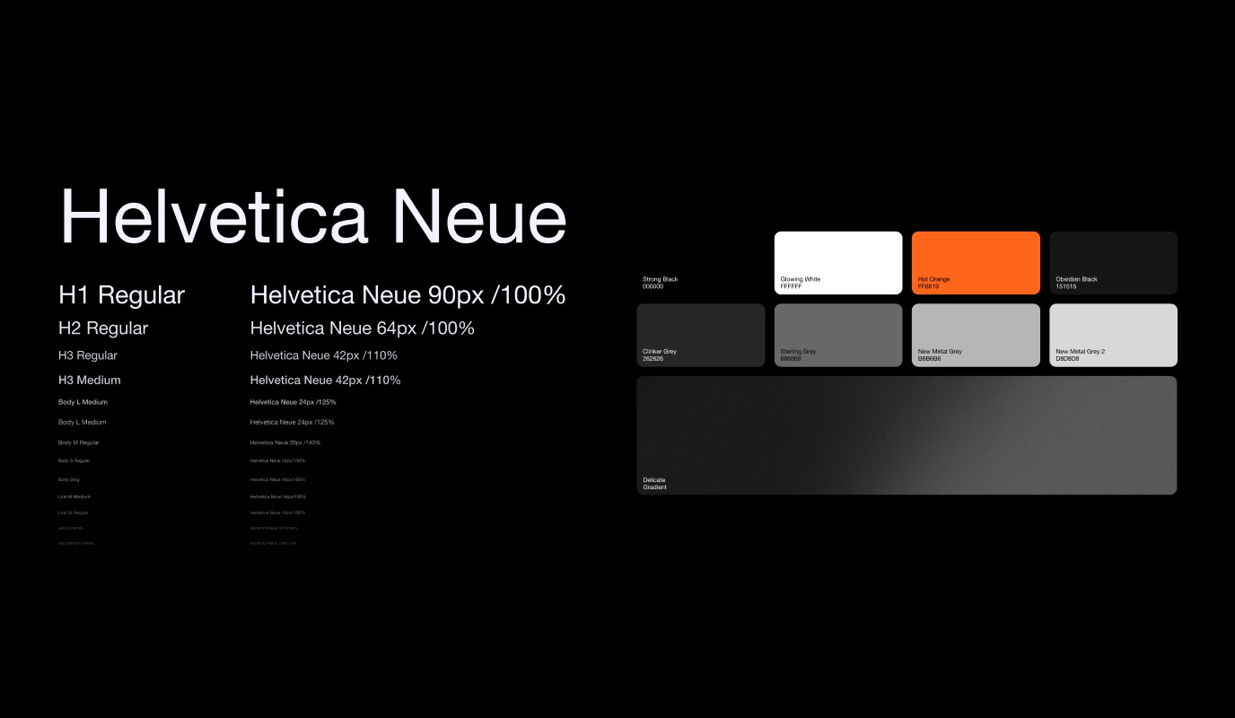 對于品牌形象設計和網(wǎng)絡材料,主要調(diào)色板由三種顏色組成:黑色、白色和橙色。還提供了額外的顏色陰影。另一個重要的圖形元素是漸變。漸變是金屬中淺色溢出的隱喻。漸變的過渡是通過黑白顏色的組合來實現(xiàn)的。根據(jù)需要,中間色調(diào)的數(shù)量可以變化。