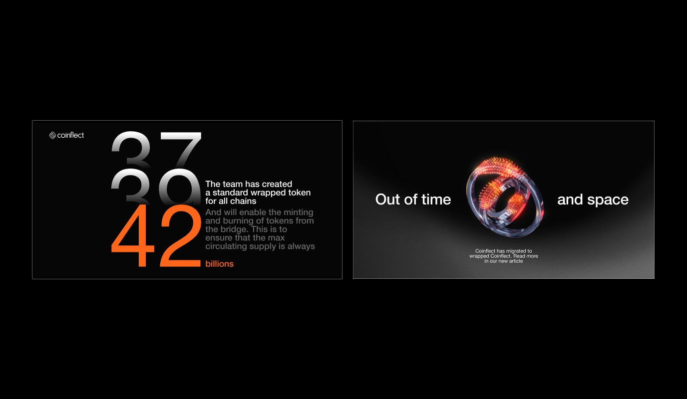 VI形象設計。這是一個無權限的多鏈dApp。它的技術為開發(fā)者提供了所有必要的工具,從令牌發(fā)射到產(chǎn)量耕作。它的解決方案允許靈活使用DeFi。Coinflect致力于開放、快速和負擔得起的交易。Embacy的目標是用新的視覺語言反映Coinflect的動態(tài)和易用性。格的中心圖形元素是金屬星盤和鏈條的3D圖像。為了創(chuàng)建一個組合,已經(jīng)編譯了一個3D元素包。3Ds用作文本的插圖,構圖支持所需的隱喻。此外,它們還被用作構圖平衡的額外圖形元素。