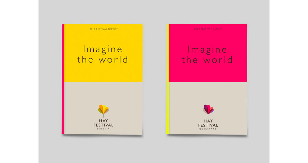 “Hay Festival”以無(wú)襯線字體出現(xiàn)在樹(shù)旁或樹(shù)下的堆疊線條中,以大寫(xiě)字母排列,威勒稱其為“經(jīng)典”,帶有“烏托邦式的感覺(jué)”。核心標(biāo)識(shí)的每一根樹(shù)枝都被設(shè)置成不同的顏色,包括紫色、粉色、橙色和黃色。該標(biāo)志以多種顏色出現(xiàn),代表了該節(jié)日分支的不同地點(diǎn),比如西班牙塞戈維亞姐妹節(jié)的不同黃色色調(diào),以及秘魯阿雷基帕的一系列紫色。威勒表示,logo選用了“充滿活力”的調(diào)色板,背景采用了“更平靜”的色調(diào),用以鼓舞和娛樂(lè)人們。
