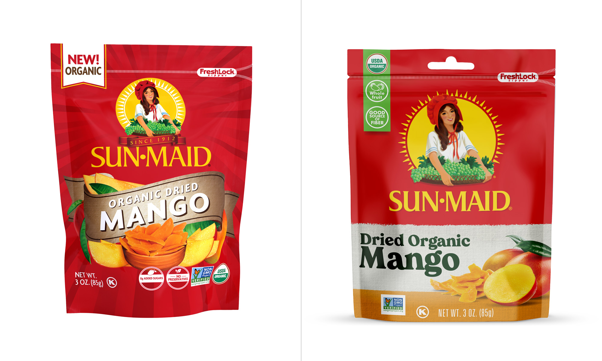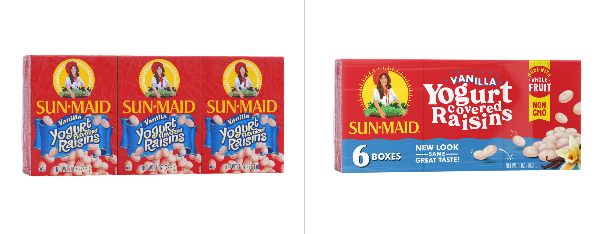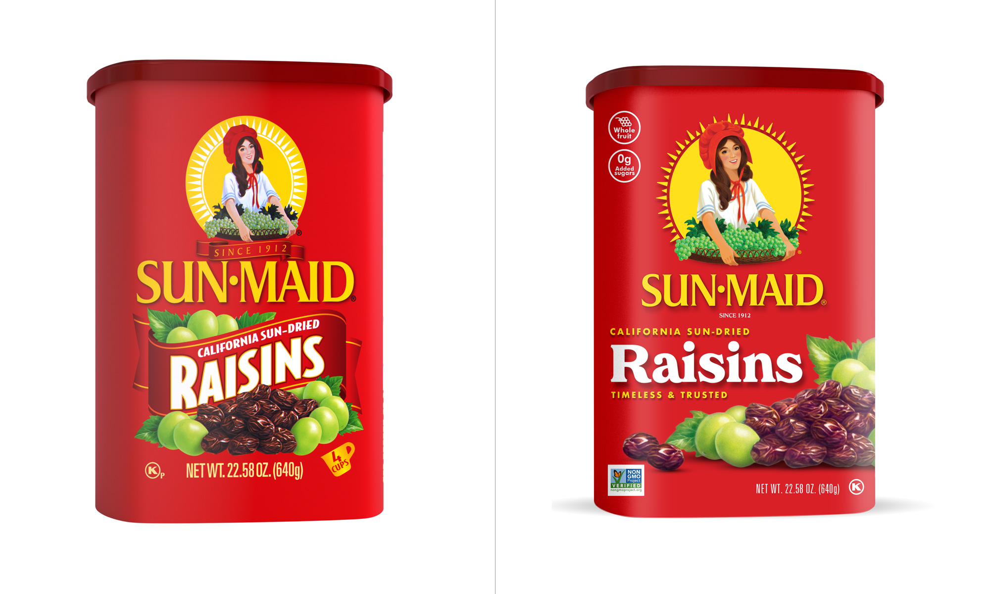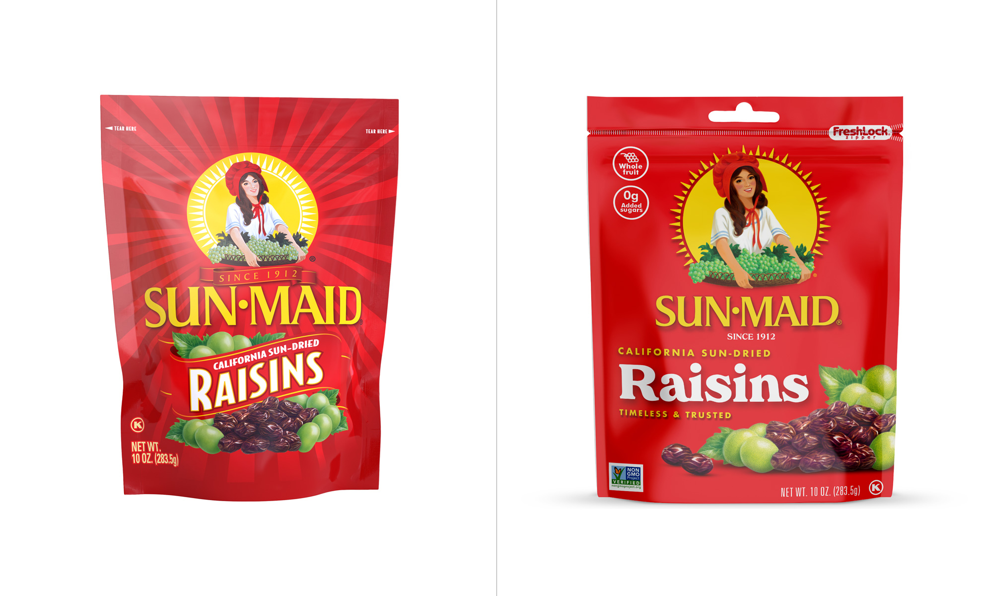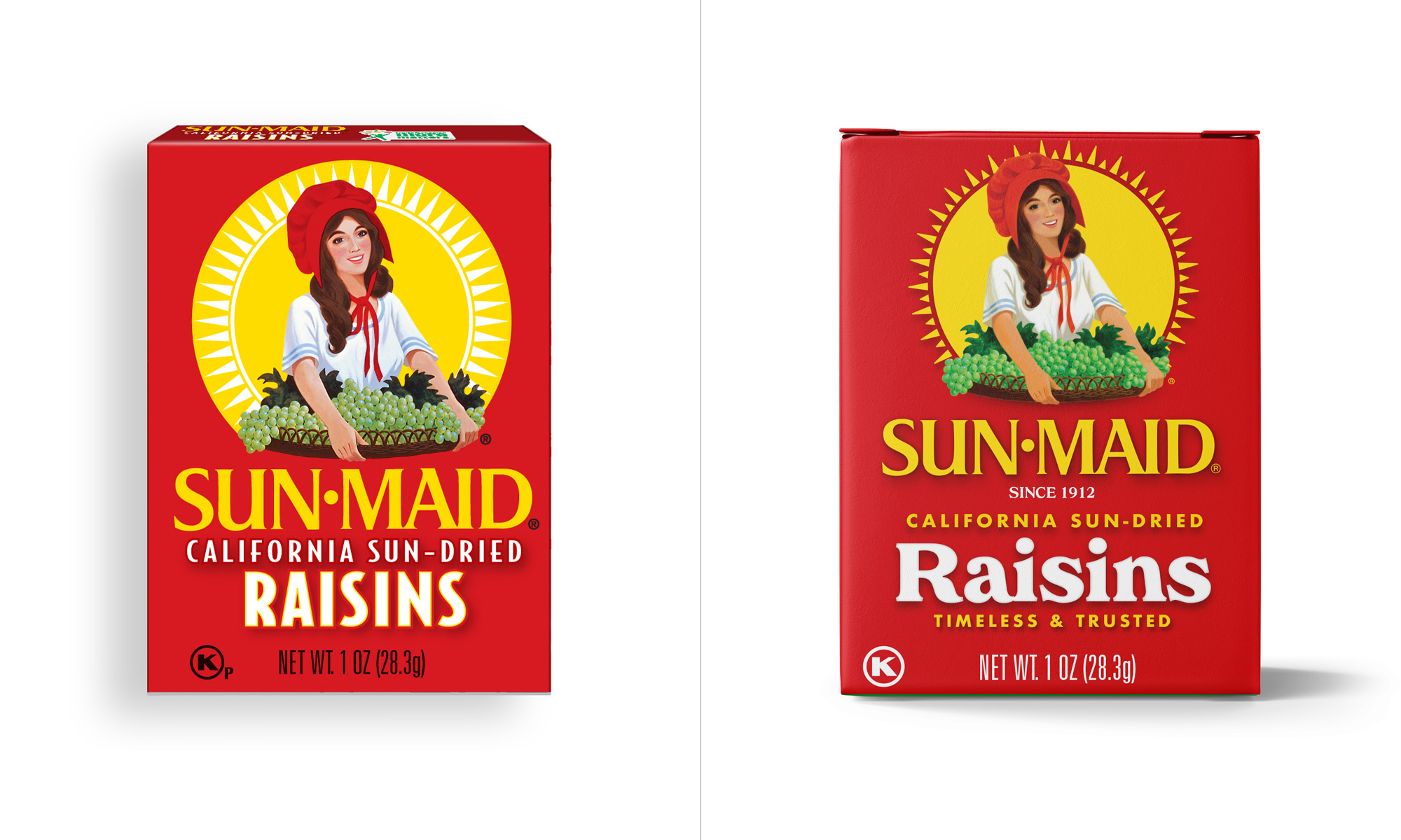 Sun-Maid食品品牌形象設計升級包括兩部分,一個是食品品牌LOGO設計升級,還有一個是食品品牌包裝設計升級。新設計升級的包裝從本月開始上架,展示了一些變化,此次升級的定位主要是吸引千禧代的購物者為他們的家人尋找健康的零食。