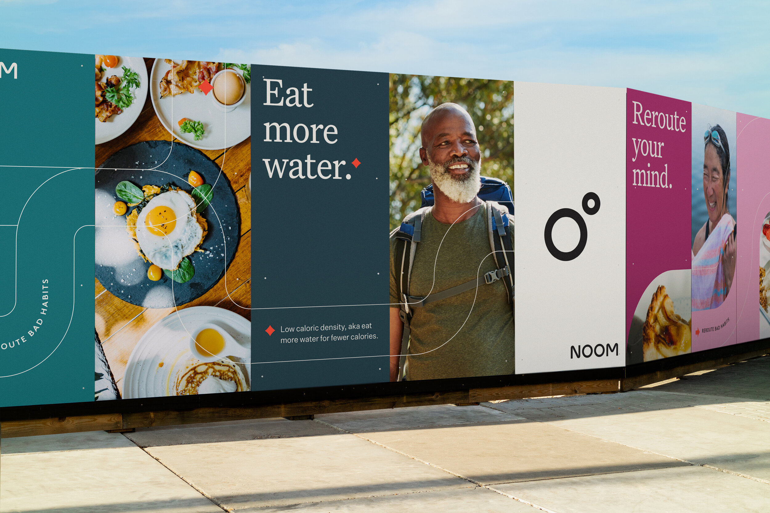 該系列調(diào)色板的靈感來自我們周圍的世界——從美味水果和蔬菜的豐富色調(diào)到郁郁蔥蔥的風(fēng)景和舒緩的紋理。一系列圖形標(biāo)記旨在引導(dǎo)觀眾的眼睛,一個(gè)強(qiáng)大的布局系統(tǒng)告知從攝影到信息的每個(gè)元素如何協(xié)同工作。我們?cè)O(shè)計(jì)了一種拼貼方法和建造指南,為Noom品牌設(shè)計(jì)的心理學(xué)支持的課程創(chuàng)建插圖,這在新的應(yīng)用程序和網(wǎng)站設(shè)計(jì)中得到了利用。