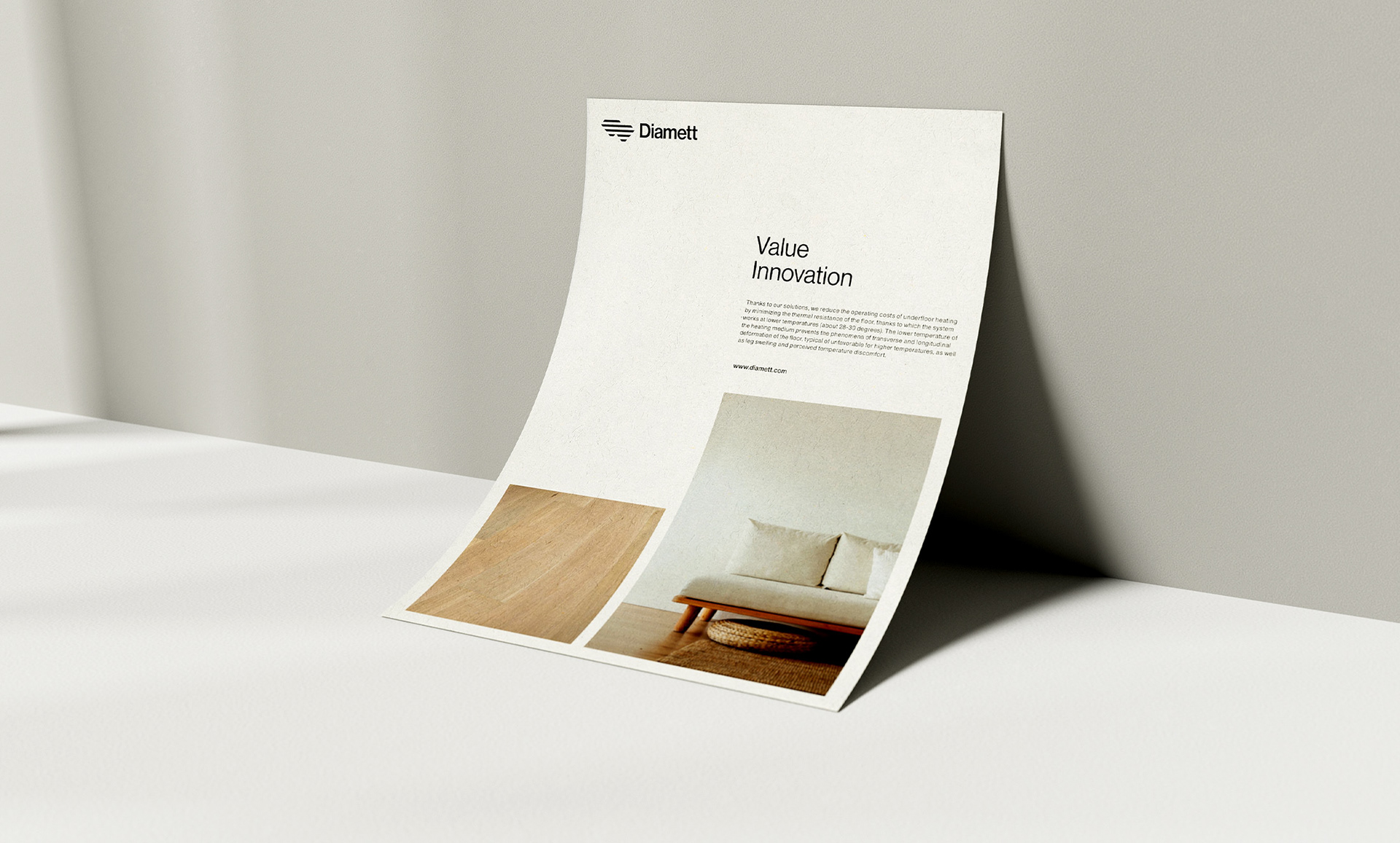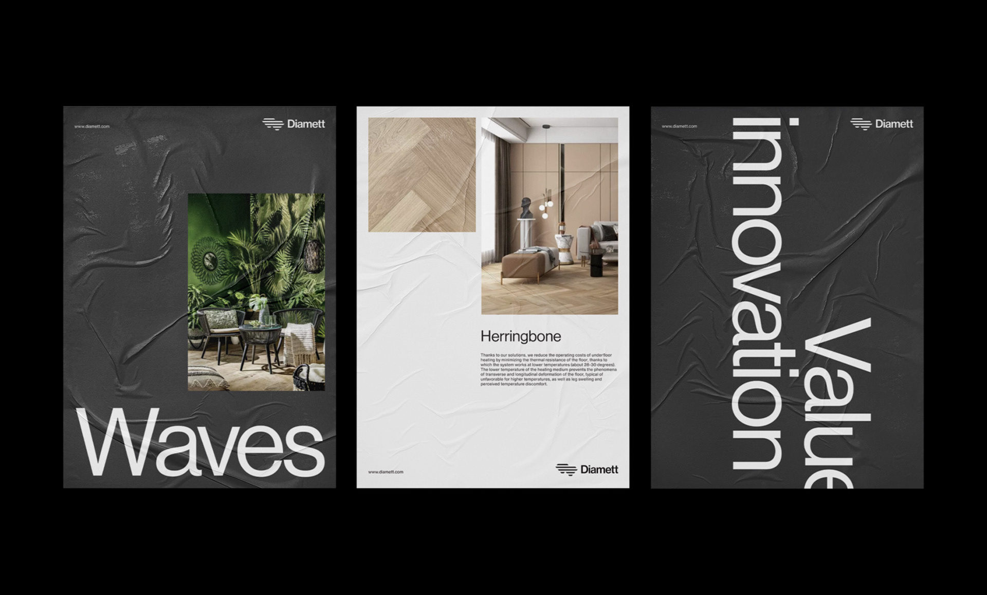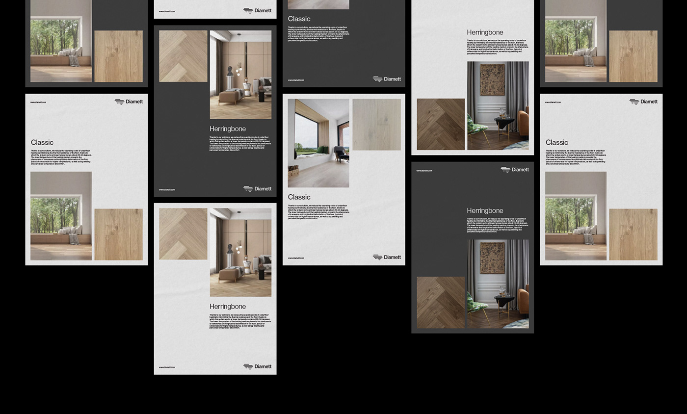 家居行業(yè)Diamett地板制造商品牌設計:Diamett是一家高端地板制造商,憑借其名為“瑞典板”的專利解決方案,擁有無與倫比的性能。七毫米厚的高密度HDF芯和八層清漆覆蓋在木材單板上,結(jié)果是地板可以承受任何虐待,在顏色和結(jié)構(gòu)上都具有自然的光潔度。該技術(shù)還具有環(huán)保效益,僅使用1/6平方米實木地板所需的木材,使直徑地板成為可持續(xù)發(fā)展的選擇,而不會影響質(zhì)量。一個額外的優(yōu)勢是地板的導熱率比常規(guī)層壓板高63.5%,這使得地板下供暖更有效,更節(jié)能。