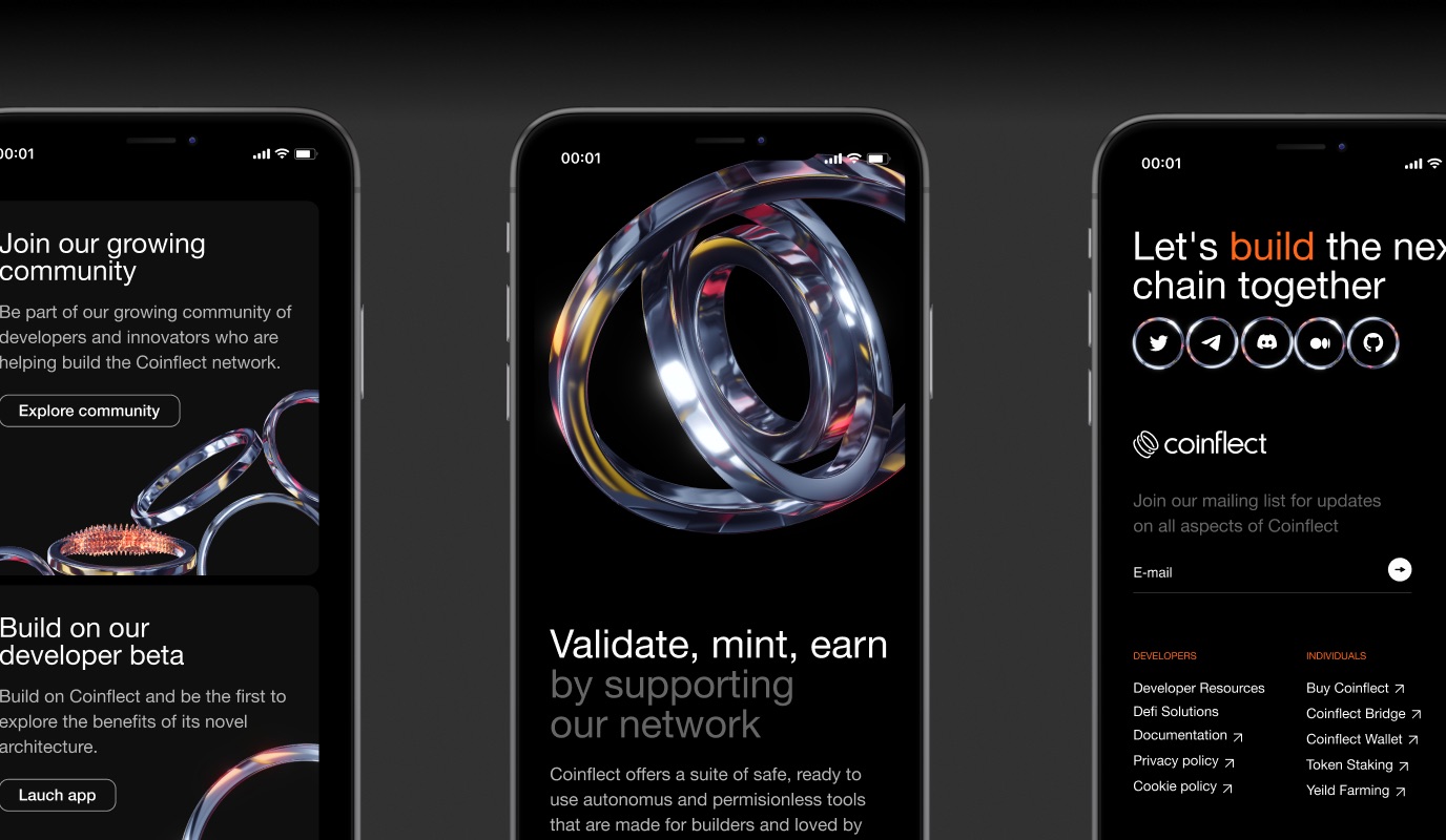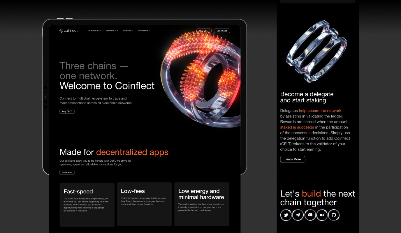 VI形象設計。這是一個無權限的多鏈dApp。它的技術為開發(fā)者提供了所有必要的工具,從令牌發(fā)射到產(chǎn)量耕作。它的解決方案允許靈活使用DeFi。Coinflect致力于開放、快速和負擔得起的交易。Embacy的目標是用新的視覺語言反映Coinflect的動態(tài)和易用性。格的中心圖形元素是金屬星盤和鏈條的3D圖像。為了創(chuàng)建一個組合,已經(jīng)編譯了一個3D元素包。3Ds用作文本的插圖,構圖支持所需的隱喻。此外,它們還被用作構圖平衡的額外圖形元素。