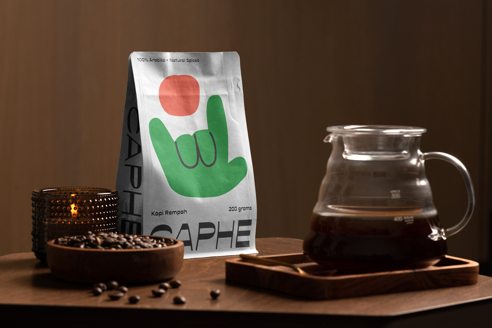 我們選擇Opposit作為Caphe的字體,這種字體是獨(dú)一無(wú)二的,字母的每個(gè)字符上都有粗而細(xì)的筆畫(huà)。在包裝設(shè)計(jì)中,我們?cè)噲D拋開(kāi)以咖啡為基礎(chǔ)的包裝設(shè)計(jì)思想。與大多數(shù)咖啡設(shè)計(jì)不同,姜汁咖啡自動(dòng)地以姜汁插圖為特色,這太普通和無(wú)聊了。我們?cè)O(shè)計(jì)了一個(gè)手勢(shì)的插圖,作為享受咖啡的滿(mǎn)足感的標(biāo)志。除了是包裝上的一個(gè)身份和設(shè)計(jì),這個(gè)插圖也是一個(gè)附屬于品牌的圖像。它與眾不同,獨(dú)一無(wú)二,引人注目。