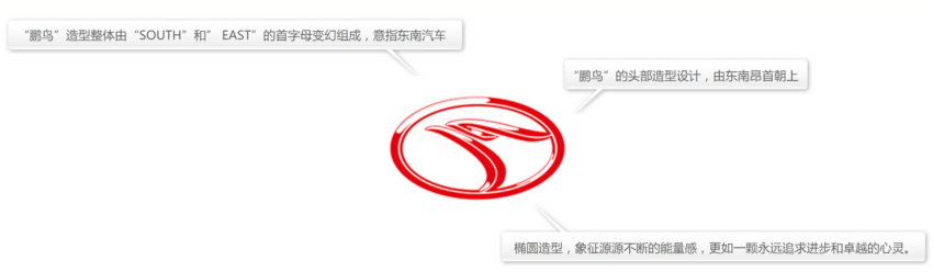 橢圓的形狀象征著源源不斷的能量感,更像是一個永遠(yuǎn)追求進(jìn)步和卓越的靈魂,“鵬鳥”的頭部造型設(shè)計(jì),由東南昂首朝上,表現(xiàn)出振翅欲飛的態(tài)勢,表現(xiàn)出企業(yè)旺盛、強(qiáng)烈的進(jìn)取心及能力,“鵬鳥”造型整體由“SOUTH”和”EAST”的首字母變幻組成,意指東南汽車。