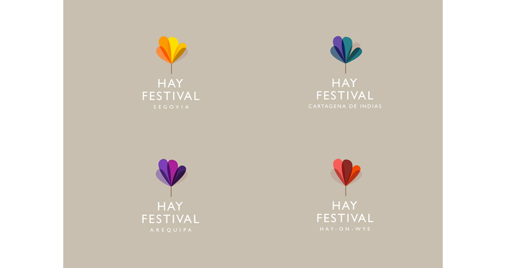 “Hay Festival”以無(wú)襯線字體出現(xiàn)在樹(shù)旁或樹(shù)下的堆疊線條中,以大寫(xiě)字母排列,威勒稱其為“經(jīng)典”,帶有“烏托邦式的感覺(jué)”。核心標(biāo)識(shí)的每一根樹(shù)枝都被設(shè)置成不同的顏色,包括紫色、粉色、橙色和黃色。該標(biāo)志以多種顏色出現(xiàn),代表了該節(jié)日分支的不同地點(diǎn),比如西班牙塞戈維亞姐妹節(jié)的不同黃色色調(diào),以及秘魯阿雷基帕的一系列紫色。威勒表示,logo選用了“充滿活力”的調(diào)色板,背景采用了“更平靜”的色調(diào),用以鼓舞和娛樂(lè)人們。
